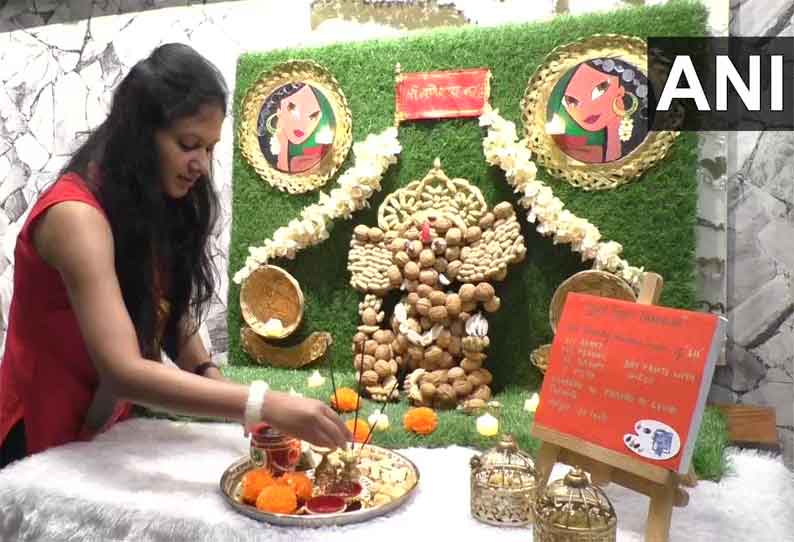 நிலக்கடலை, பாதாம் பருப்பு, முந்திரி, பைன் விதைகள் உள்ளிட்ட உலர்ந்த பழங்களுடன் காட்சியளிக்கும் இந்தப் பிள்ளையாரை மக்கள் ஆச்சரியத்துடன் பார்த்து செல்கின்றனர்.