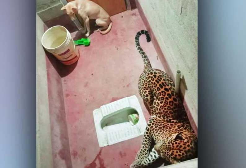 ‘ரெகப்பா என்பவர் வீட்டின் கழிவறையில் நாயும், சிறுத்தையும் இருப்பதாகவும், அதனை பூட்டி வைத்திருப்பதாகவும் வனத்துறை தகவல் தெரிவித்தனர். சம்பவ இடத்திற்கு வனத்துறை ஊழியர்கள் சென்று சிறுத்தை மற்றும் நாயை வெளியேற்ற முயற்சிகளை மேற்கொண்டனர். கழிப்பறைக்கு வெளியே ஒரு கூண்டு வைக்கப்பட்டு, அதனை சுற்றி ஒரு வலையும் அமைக்கப்பட்டது.
