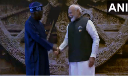 ஜி20 மாநாட்டில் பங்கேற்க பாரத் மண்டபம் வந்த நைஜீரிய அதிபர் பொலா அகமது தினுபுவை பிரதமர் மோடி வரவேற்றார்.
