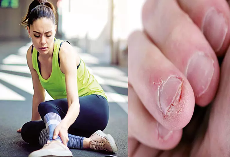 நகங்களில் வெடிப்போ, சேதமோ ஏற்பட்டால் உடலில் பயோட்டின், புரதம் மற்றும் துத்தநாகம் குறைபாடு இருப்பதன் அறிகுறிகளாகும். உணவில் முட்டை, தானியங்கள், நட்ஸ்கள், பாலாடைக்கட்டி, பால் போன்ற உணவுகளை சேர்த்துக் கொள்ள வேண்டும்.