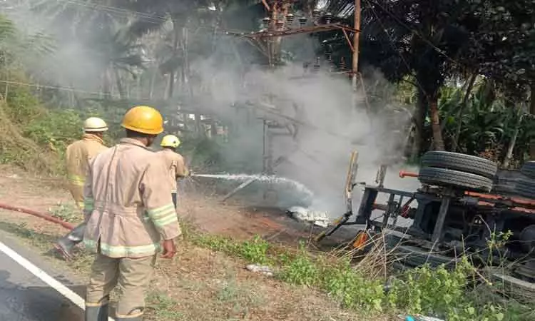 பொள்ளாச்சி அருகேடிரான்ஸ்பார்மர் மீது லாரி மோதி கவிழ்ந்தது- டிரைவர் உயிர்தப்பினார்