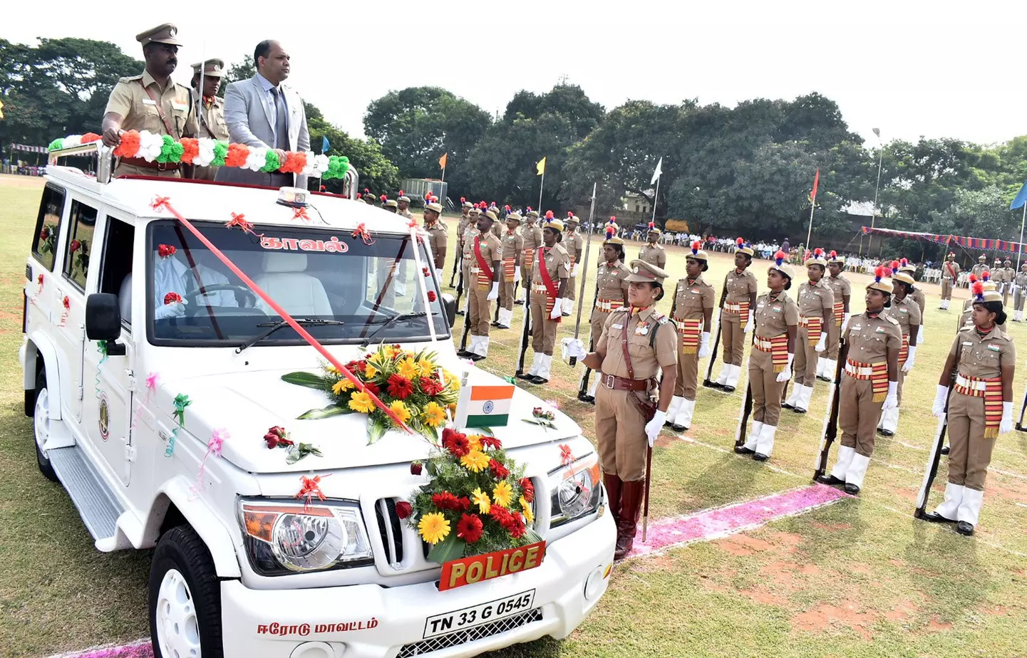 ஈரோடு மாவட்ட கலெக்டர் எச்.கிருஷ்ணனுண்ணி, கலெக்டரின் முகாம் அலுவலகத்தில் இருந்து அரசு மரியாதையுடன் வ.உ.சி.பூங்கா மைதானத்துக்கு அழைத்து வரப்பட்டார். மைதானத்தின் நுழைவு வாயிலில், மாவட்ட போலீஸ் சூப்பிரண்டு சசிமோகன், மாவட்ட ஊரக வளர்ச்சி முகமை திட்ட இயக்குனர் எல்.மதுபாலன், மாவட்ட வருவாய் அதிகாரி சந்தோஷினி சந்திரா, ஆர்.டி.ஓ. சதீஸ்குமார், கூடுதல் போலீஸ் சூப்பிரண்டுகள் பாலமுருகன், கனகேஸ்வரி உள்ளிட்ட அதிகாரிகள் வரவேற்பு அளித்தனர். கிறிஸ்து ஜோதி பள்ளிக்கூட பெருவங்கி இசைக்குழு மாணவிகள் வாத்தியங்கள் முழங்க, கலெக்டர் எச்.கிருஷ்ணனுண்ணி, போலீஸ் சூப்பிரண்டு சசிமோகன் ஆகியோர் கொடி மேடைக்கு அழைத்து வரப்பட்டனர்.