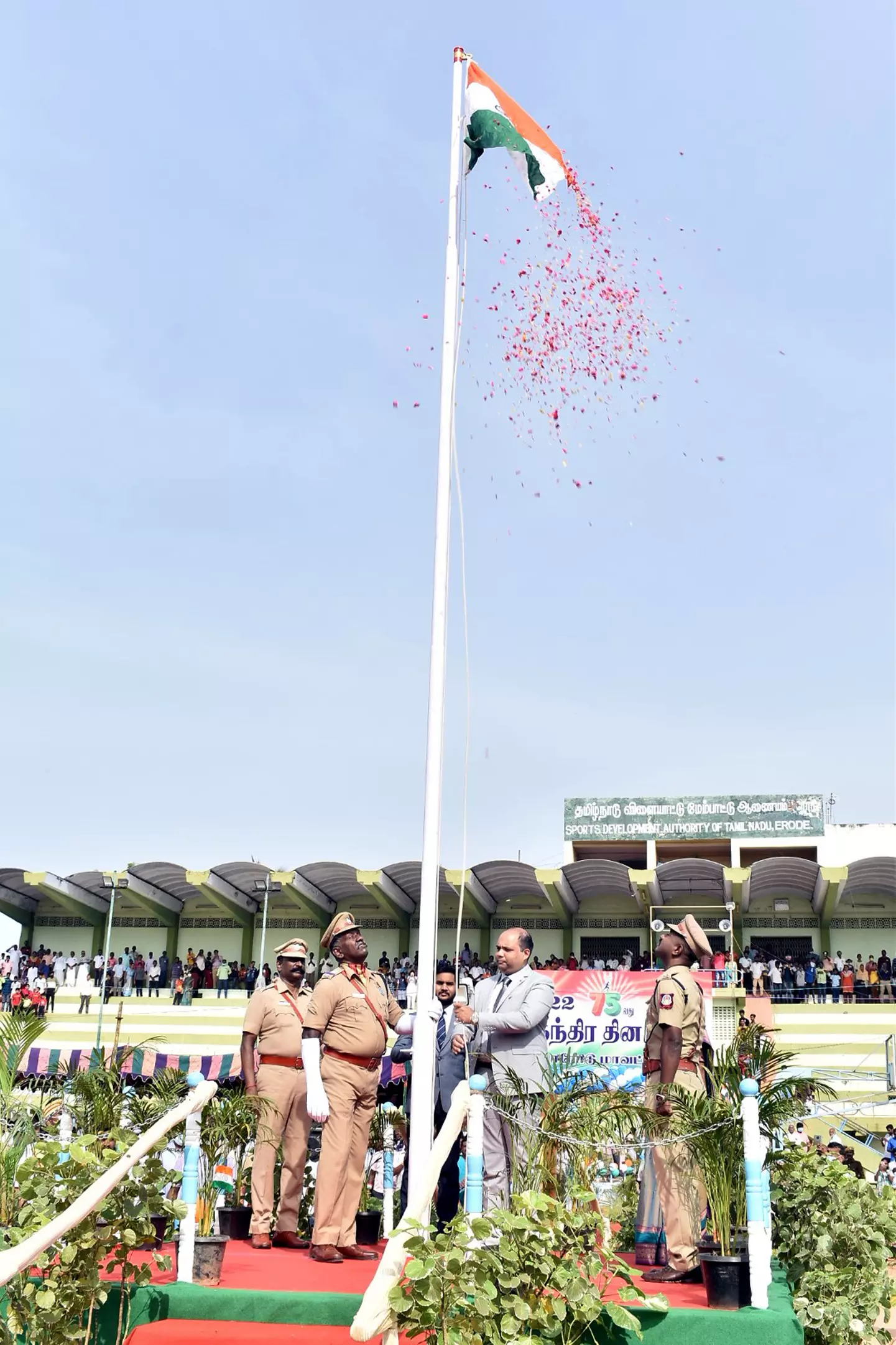 ஈரோடு மாவட்ட நிர்வாகம் சார்பில் சுதந்திர தின விழா ஈரோடு வ.உ.சி.பூங்கா விளையாட்டு மைதானத்தில் நேற்று நடந்தது. விளையாட்டு அரங்கின் மத்தியில் தேசியக்கொடி ஏற்றுவதற்கான கொடி கம்பம் தயார் நிலையில் இருந்தது. மைதானத்துக்கு காலையில் இருந்தே அதிகாரிகள், பொதுமக்கள் வரத்தொடங்கினார்கள். காலை 9 மணிக்கு ஈரோடு மாவட்ட போலீஸ் சூப்பிரண்டு சசிமோகன் மைதானத்துக்கு வந்து கொடி மேடையை பார்வையிட்டார். அவருக்கு போலீஸ் மரியாதை அளிக்கப்பட்டது.