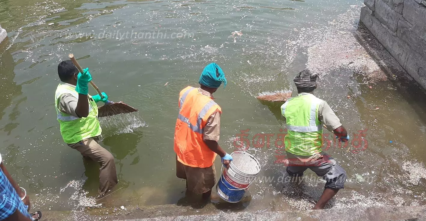 உலக தண்ணீர் தினத்தையொட்டி நாமக்கல் நகராட்சி ஆணையாளர் சுதா உத்தரவின் பேரில் நகராட்சி தூய்மை பணியாளர்கள் கோட்டை சாலையில் உள்ள ஜெட்டி குளத்தில் கழிவுகளை அகற்றி சுத்தம் செய்யும் பணியில் ஈடுபட்டனர். அப்போது அங்கு பொதுமக்கள் கழிவுகளை நீர் நிலைகளில் கொட்ட வேண்டாம் என அறிவிப்பு பதாகையும் அங்கு வைக்கப்பட்டது.