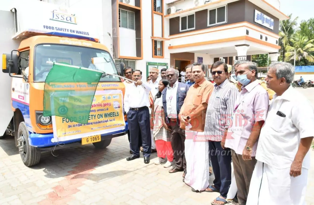 உணவு தர பரிசோதனை மேற்கொள்ள நடமாடும் பகுப்பாய்வு கூட வாகனத்தை கலெக்டர் மகாபாரதி கொடியசைத்து தொடங்கி வைத்தார்.