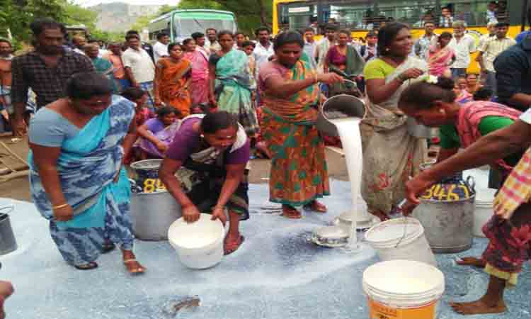 சாலையில் பாலை கொட்டி பொதுமக்கள் போராட்டம்