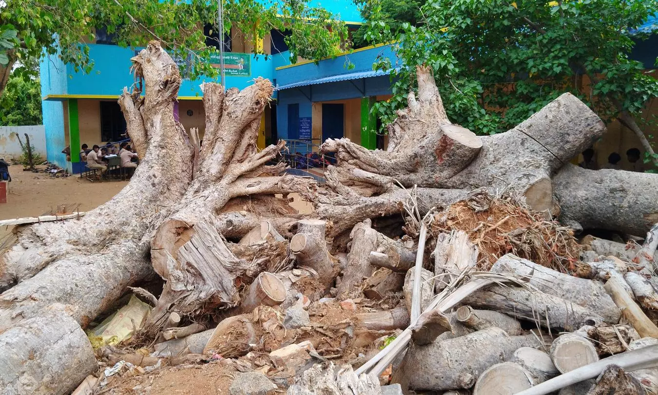 பள்ளி வளாகத்துக்குள் வெட்டப்பட்ட மரங்கள் அகற்றப்படாமல் உள்ளன