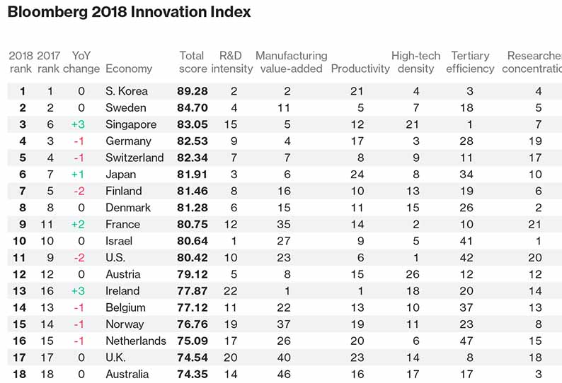 ஒரு நாட்டிலுள்ள மொத்த தொழில்நுட்ப நிறுவனங்கள் மற்றும் அதில் பணிபுரியும் அறிவியல் மற்றும் பொறியியல் துறை ஊழியர்களையும் செயல்பாட்டையும் அடிப்படையாகக் கொண்டு ப்ளூம்பெர்க் இதழ் பட்டியல் ஒன்றை வெளியிட்டுள்ளது.
