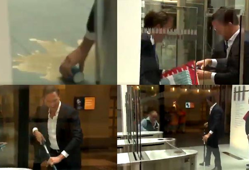 டச்சு பாராளுமன்றத்தில் பிரதமர் மார்க் ரூடே காபியை எடுத்துச் செல்கிறார். எதிர்பாராத விதமாக தரையில் கொட்டிவிடுகிறார். காபி கொட்டியதும் அதிர்ச்சியாக பார்க்கும் அவர், அங்கிருந்த பணியாளரிடம் துடைப்பானை வாங்கினார். துடைப்பானை கொண்டு தரையை அசுத்தப்படுத்திய காபியை சுத்தம் செய்தார். அவருடைய பணியை பார்த்து அங்கிருக்கும் பணியாளர்கள் பாராட்டுகிறார்கள்.