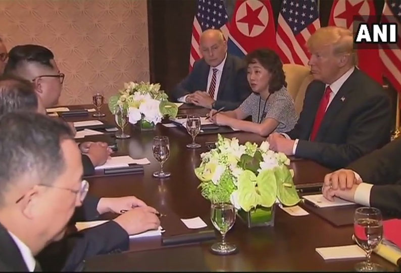 இதையடுத்து, திட்டமிட்ட படி இன்று (ஜூன் 12) சிங்கப்பூர் சென்டோசா தீவில் உள்ள நட்சத்திர ஓட்டலில், வடகொரியா அதிபர் கிம் ஜாங் அன் - அமெரிக்க அதிபர் டொனால்டு டிரம்ப் இடையேயான சந்திப்பு நடைபெற்றது. உலக நாடுகள் உற்று நோக்கிய இந்த சந்திப்பு சுமார் 41 நிமிடங்கள் நீடித்தது. இரு நாட்டு தலைவர்களும் நேரடியாக சந்தித்துக்கொள்வது வரலாற்றில் இதுதான் முதல் தடவையாகும். இந்த சந்திப்பின் போது, அணு ஆயுத கைவிடல், பொருளாதார பிரச்சினை ஆகியவை குறித்து இரு தலைவர்களும் ஆலோசனை நடத்தினர். சந்திப்புக்கு பிறகு, பால்கனியில் வந்து இரு தலைவர்களும் செய்தியாளர்களை பார்த்து கையசத்தனர்.