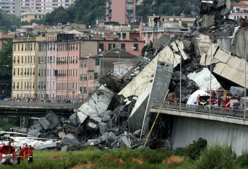 இத்தாலியின் துறைமுக நகரான ஜெனோவாவில் 10ஏ தேசிய நெடுஞ்சாலையில் மொராண்டி என்னும் 200 மீட்டர் நீள பாலம் உள்ளது. இந்த நிலையில், இதன் ஒரு பகுதியானது நேற்று முன்தினம் திடீரென இடிந்து, 100 அடி கீழே இருந்த புறநகர் ரெயில் பாதை மீது விழுந்தது. இந்த அதிர்வு காரணமாக அருகில் இருந்த கட்டிடங்களும் இடிந்து விழுந்தன.