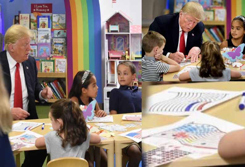 ஓஹியோவில் உள்ள குழந்தைகளுக்கான மருத்துவமனைக்கு தனது மனைவி மெலனியாவுடன் சென்றார் டொனால்ட் டிரம்ப். அங்கு சிகிச்சை பெற்று வரும் குழந்தைகளுடன் அமெரிக்க தேசியக் கொடியை வரைந்த அதிபர் டொனால்ட் டிரம்ப், வெள்ளை நிறக் கோடுகளுக்கு பதிலாக நீல நிறத்திலான கோடுகளை போட்டிருந்தார்.