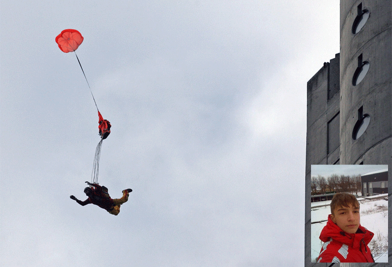 இதற்காக அவன் வீட்டிலேயே பாராசூட் ஒன்றை தயார் செய்தான். பின்னர் அந்த பாராசூட்டை பரிசோதித்து பார்க்க முடிவு செய்த சிறுவன் வீட்டின் அருகே உள்ள 14 மாடிகளை கொண்ட அடுக்குமாடி குடியிருப்பின் உச்சிக்கு சென்றான்.