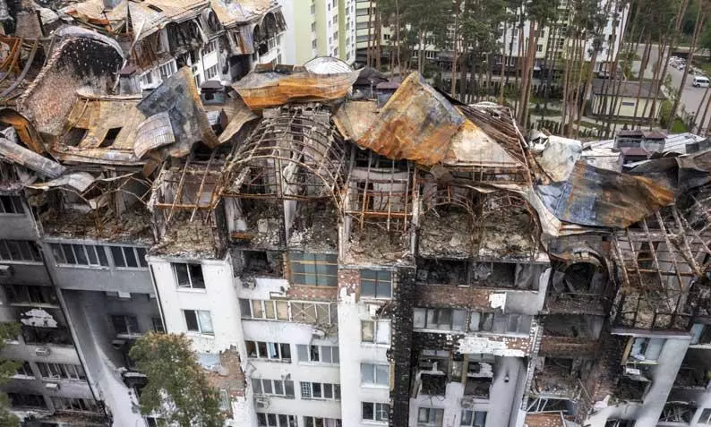 உக்ரைனின் இர்பின் நகரில் ரஷிய தாக்குதலால் உருக்குலைந்த குடியிருப்பு கட்டிடம் (படம் - AP)