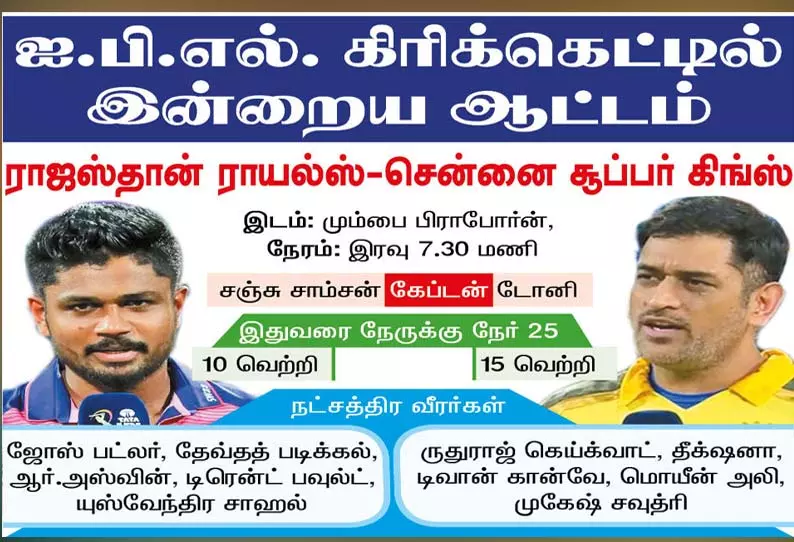 நடப்பு சாம்பியன் சென்னை சூப்பர் கிங்ஸ் அணி 13 ஆட்டங்களில் ஆடி 4 வெற்றி, 9 தோல்வியுடன் 8 புள்ளிகள் பெற்று 9-வது இடத்தில் உள்ளது. அதிக முறை பிளே-ஆப் சுற்றுக்கு தகுதி பெற்றுள்ள சென்னை அணி ஒரு முறை கூட கடைசி இடத்துக்கு தள்ளப்பட்டது கிடையாது. இதனால் அந்த அணி புள்ளிபட்டியலில் மேலும் கீழே இறங்கிவிடக்கூடாது என்ற மனநிலையுடன் இருக்கும். அத்துடன் முந்தைய 2 லீக் ஆட்டங்களில் மும்பை, குஜராத் அணிகளிடம் அடுத்தடுத்து தோல்வி கண்ட சென்னை அணி ஆறுதல் வெற்றியுடன் விடைபெற வியூகம் வகுக்கும். வலுவான நிலையில் இருக்கும் ராஜஸ்தான் அணியின் சவாலை சமாளிக்க வேண்டும் என்றால் சென்னை அணி பேட்டிங் மற்றும் பந்து வீச்சில் ஒருசேர ஜொலிக்க வேண்டியது அவசியமானதாகும்.