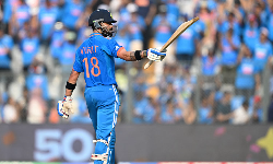 நிதான ஆட்டத்தை வெளிப்படுத்தி வரும் விராட் கோலி 59 பந்தில் 50 ரன்கள் அடித்துள்ளார்.