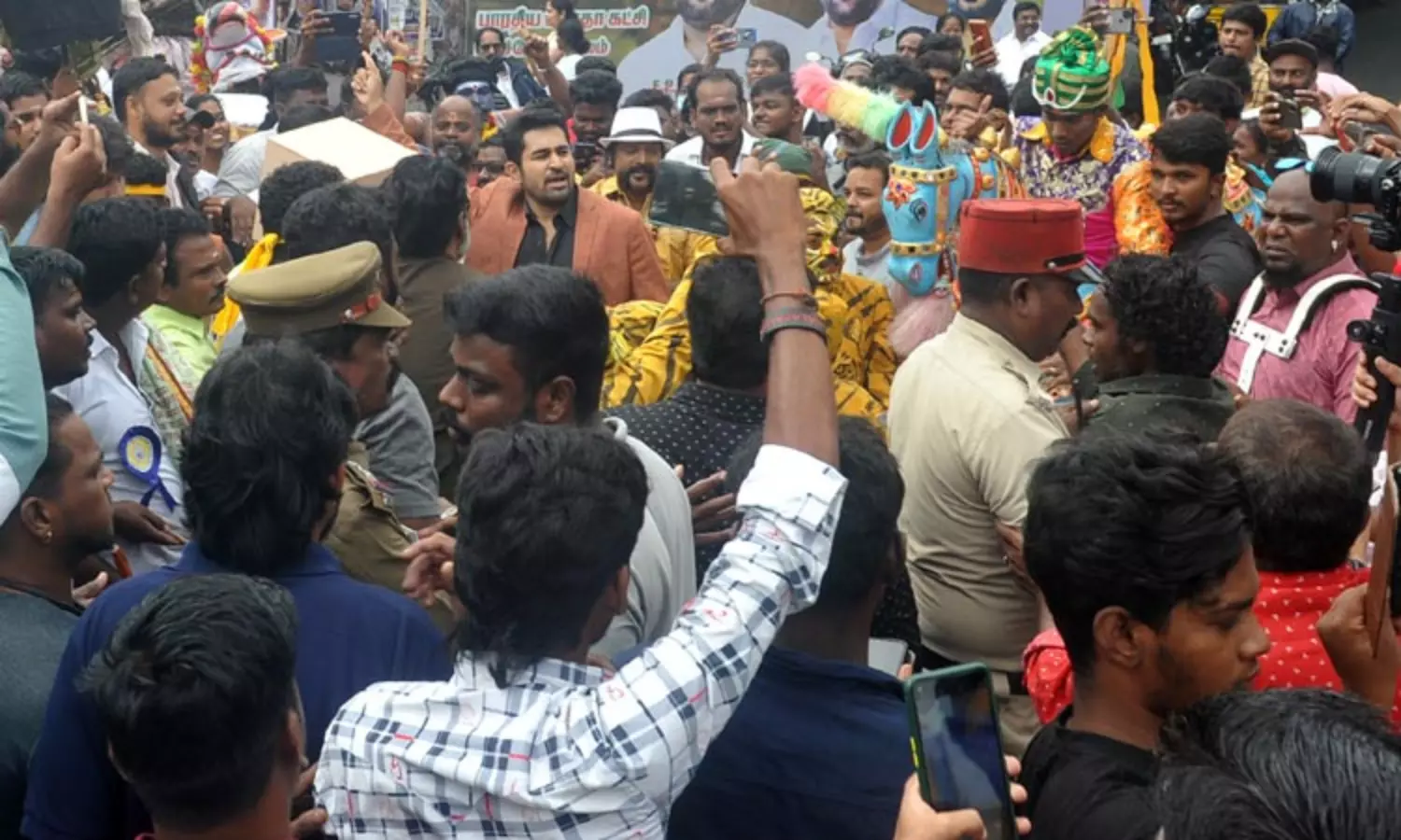 சங்கரதாஸ் சுவாமிகளின் 100வது ஆண்டு நினைவு நாளையொட்டி புதுச்சேரியில் நாடகக்கலைஞர்கள் சார்பில் நடைபெற்ற ஊர்வலத்தில் விஜய் ஆண்டனி கலந்துகொண்டு நடனமாடி உற்சாகப்படுத்தினார்.;