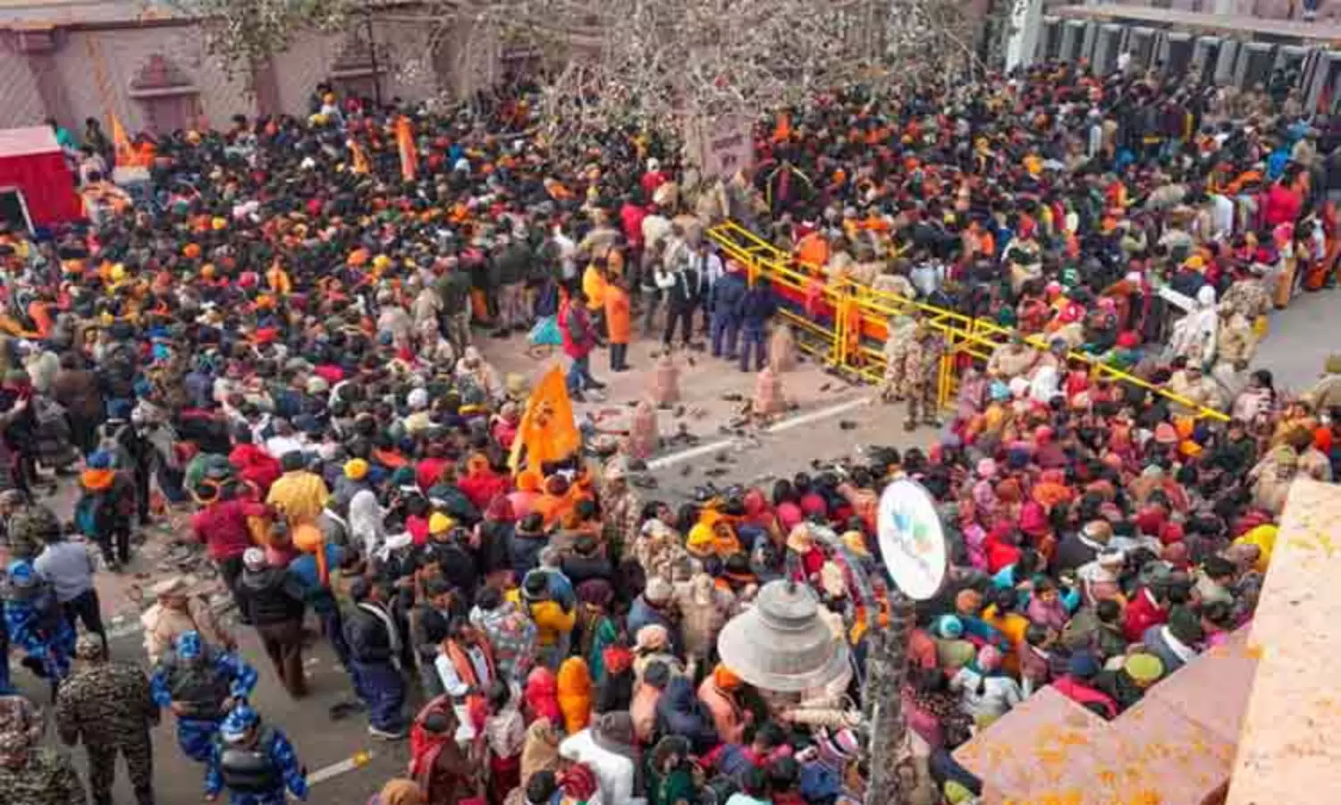 பாதுகாப்பு வீரர்கள், பணிக்கு அமர்த்தப்பட்ட தெருக்களில், கட்டுக்கடங்காமல் மக்கள் கூட்டம் அதிகரித்து காணப்பட்டது. அவர்களில் பலரும் ஜெய் ஸ்ரீராம் என கோஷமிட்டபடி இருந்தனர். நுழைவாசல் வழியே அவர்கள் உள்ளே நுழைய முயன்றனர்.