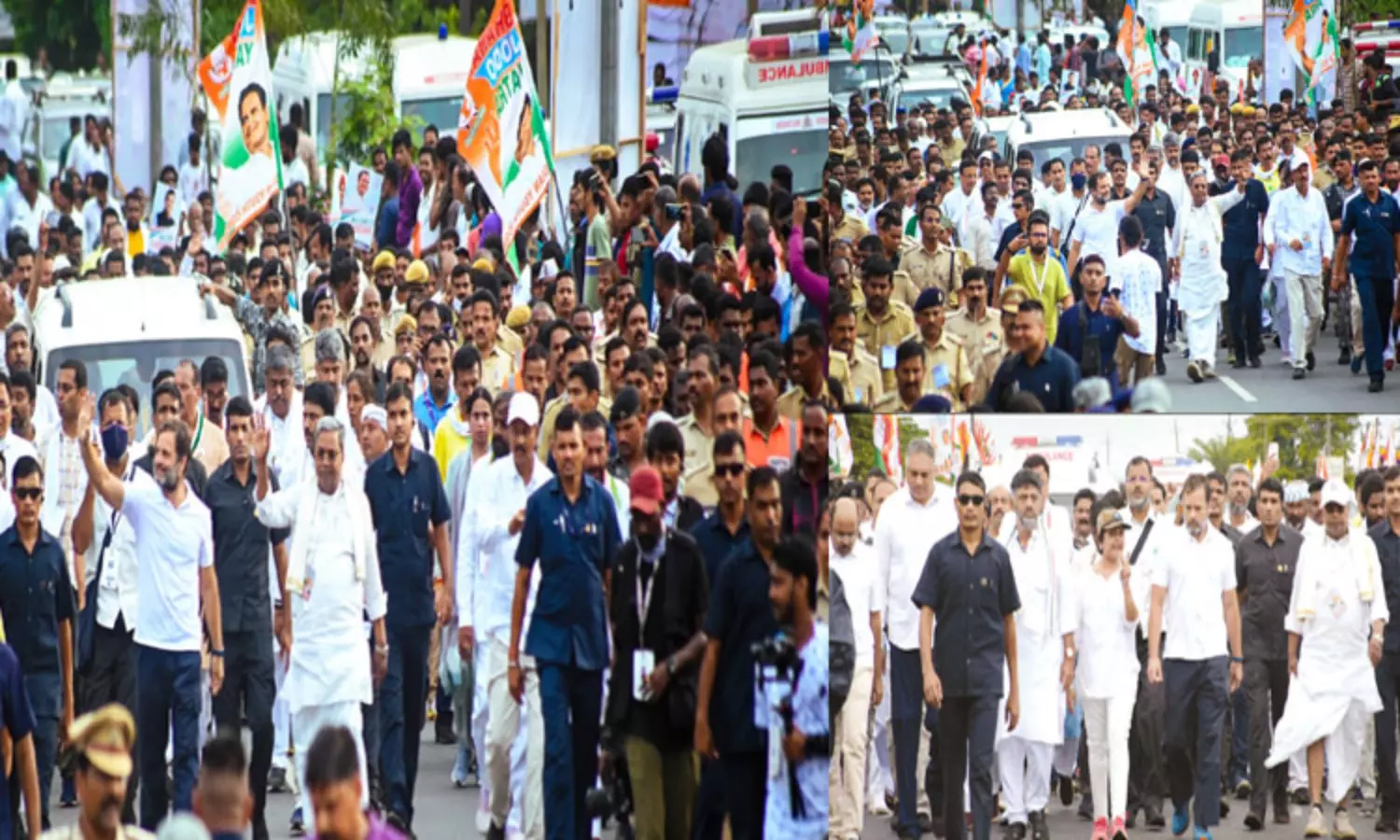 45 நிமிடங்களுக்கு பிறகு மழை நின்றதும் காலை 7.15 மணிக்கு ராகுல்காந்தி பாதயாத்திரையை தொடங்கினார். அப்போதும் சாரல் மழை பெய்து கொண்டிருந்தது. ஆனாலும் அதனை பொருட்படுத்தாமல் ராகுல்காந்தி நடந்து சென்றார். அவருடன் மாநில காங்கிரஸ் தலைவர் டி.கே.சிவக்குமார், எதிர்க்கட்சி தலைவர் சித்தராமையா, காங்கிரஸ் மேலிட பொறுப்பாளர் ரன்தீப் சிங் சுர்ஜேவாலா, சித்தராமையாவின் மகனும், வருணா தொகுதி எம்.எல்.ஏ.வுமான யதீந்திரா மற்றும் காங்கிரஸ் தொண்டர்கள், மக்கள் என ஆயிரக்கணக்கானோர் இந்த பாதயாத்திரையில் கலந்துகொண்டு நடந்து சென்றனர்.