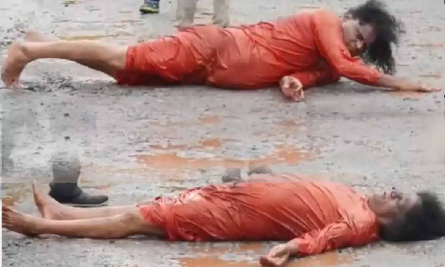 கர்நாடகா: குண்டும், குழியுமான சாலையை சீரமைக்க கோரி சாலையில் உருண்டு நூதன போராட்டம்