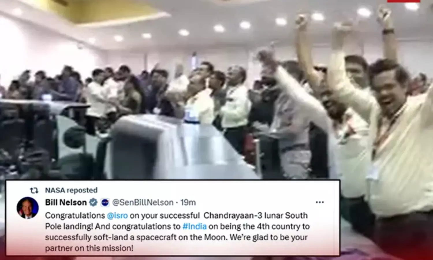 இந்த நிலையில், சந்திரயான் 3 லேண்டரின் வெற்றிக்காக இஸ்ரோவுக்கு நாசா வாழ்த்து தெரிவித்துள்ளது. இது தொடர்பாக வெளியிடப்பட்டுள்ள வாழ்த்து செய்தியில் "சந்திரயான்-3 நிலவின் தென் துருவத்தில் வெற்றிகரமாக தரையிறங்கியதற்கு இஸ்ரோவுக்கு வாழ்த்துகள்!. நிலவில் விண்கலத்தை வெற்றிகரமாக தரையிறக்கிய 4-வது நாடான இந்தியாவுக்கு வாழ்த்துகள். இந்த பணியில் உங்கள் பங்காளியாக இருப்பதில் நாங்கள் மகிழ்ச்சியடைகிறோம்" என்று தெரிவித்துள்ளது.