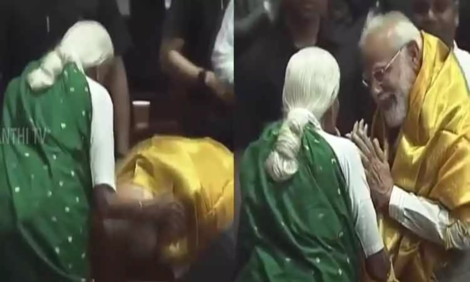 இந்த விழாவின் போது பாப்பம்மாள் பாட்டி, பிரதமர் மோடியை சந்தித்து அவருக்கு சால்வை அணிவித்து வாழ்த்து தெரிவித்தார். அப்போது பிரதமர் மோடி, பாப்பம்மாள் பாட்டியின் காலை தொட்டு அவரிடம் ஆசி பெற்றார்.
