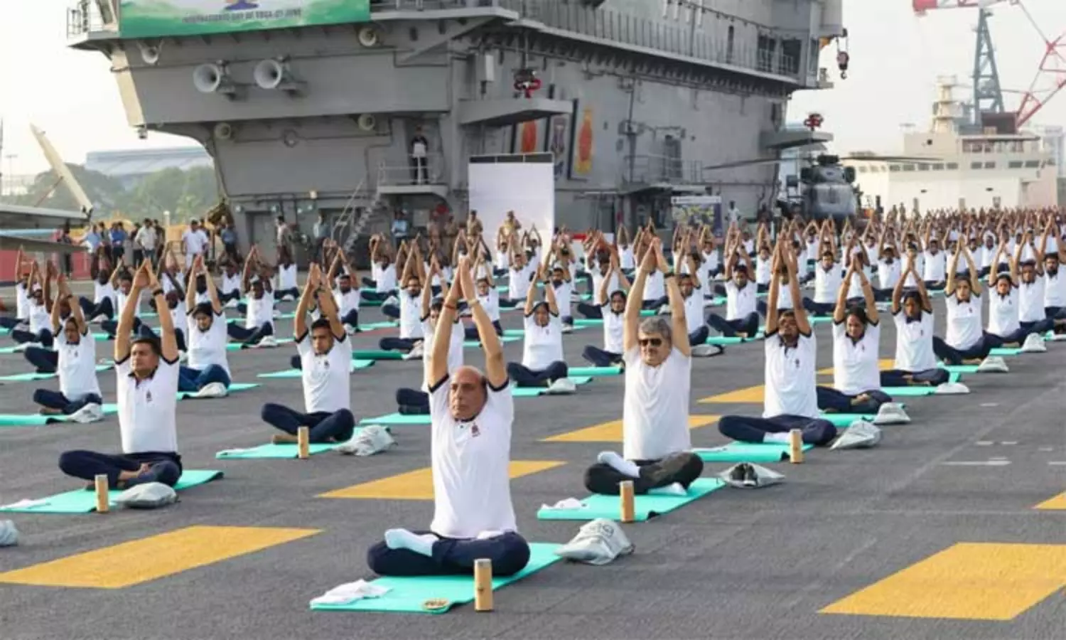 அதில், ராஜ்நாத்சிங் கலந்து கொண்டு பல்வேறு ஆசனங்களை செய்தார். கடற்படை வீரர்கள், 'அக்னிபத்' திட்டத்தில் தேர்வு செய்யப்பட்ட அக்னி வீரர்கள் ஆகியோர் கப்பலில் வரிசையாக அமர்ந்து யோகா செய்தனர்.