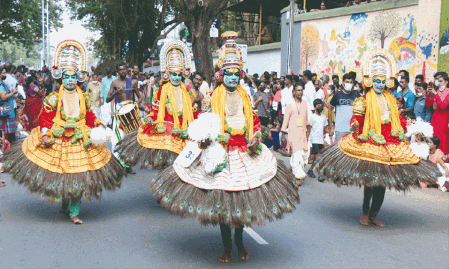 ஊர்வலத்தில் குதிரைப்படை வீரர்கள் அணிவகுத்து செல்ல, மோகினியாட்ட பெண்கள் அணிவகுப்பை அலங்ரித்தனர். கேரள பாரம்பரிய உடையணிந்த 100 ஆண்கள் முத்துக்குடை ஏந்தி முன் சென்றனர். தொடர்ந்து, வேலகளி, கதகளி, ஆலவட்டம், தெய்யம், படயணி, புலிக்களி, நீலக்காவடி உட்பட 77 வகை கலை குழுவினரின் கலாச்சார அணிவகுப்பு இடம்பெற்றது.