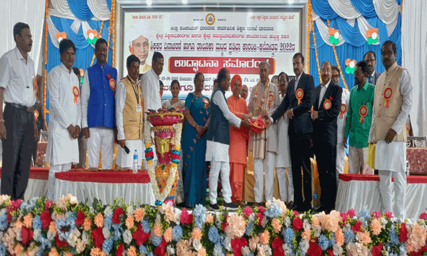 இந்த விழாவில் அலங்கரித்து வைக்கப்பட்டிருந்த சர்வபள்ளி டாக்டர் ராதாகிருஷ்ணன் உருவப்படத்துக்கு ஜெகதீஷ் ஷெட்டர், பசவராஜ் ஹொரட்டி உள்ளிட்டோர் மலர்தூவி மரியாதை செலுத்தினர். இதையொட்டி ஓய்வு பெற்ற ஆசிரியர்களுக்கு நினைவு பரிசு வழங்கப்பட்டது. மேலும் 8 முறை எம்.எல்.சி.யாக தேர்ந்தெடுக்கப்பட்ட பசவராஜ் ஹொரட்டிக்கும் பாராட்டு தெரிவிக்கப்பட்டது.
