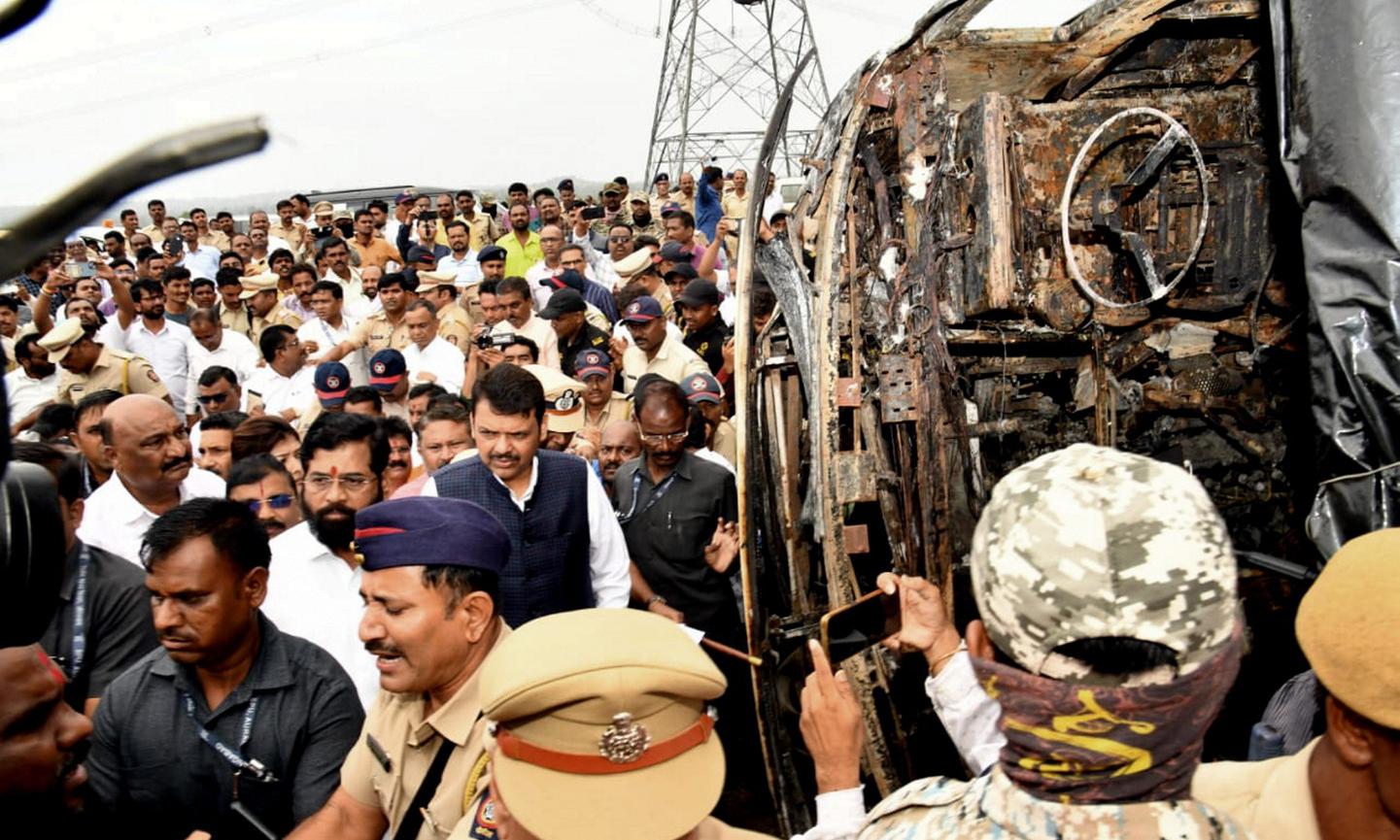 இந்தநிலையில் விபத்து குறித்து தகவல் அறிந்த முதல்-மந்திரி ஏக்நாத் ஷிண்டே, துணை முதல்-மந்திரி தேவேந்திர பட்னாவிஸ் சம்பவ இடத்துக்கு விரைந்தனர். அவர்கள் விபத்து நடந்த பகுதியை ஆய்வு செய்தனர். ஆய்வுக்கு பிறகு முதல்-மந்திரி ஏக்நாத் ஷிண்டே சம்பவம் குறித்து விசாரணைக்கு உத்தரவிட்டு இருப்பதாக கூறினார். மேலும் விபத்தில் உயிரிழந்தவர்களின் குடும்பத்துக்கு தலா ரூ.5 லட்சம் இழப்பீடு வழங்கப்படும் என அறிவித்தார். துணை முதல்-மந்திரி தேவேந்திர பட்னாவிஸ் கூறுகையில், " விபத்தில் பலியானவர்கள் உடல் அடையாளம் காண முடியாத அளவுக்கு கருகி உள்ளது. உடல்களை அடையாளம் காண டி.என்.ஏ. சோதனை செய்யப்படும் " என்றார்.