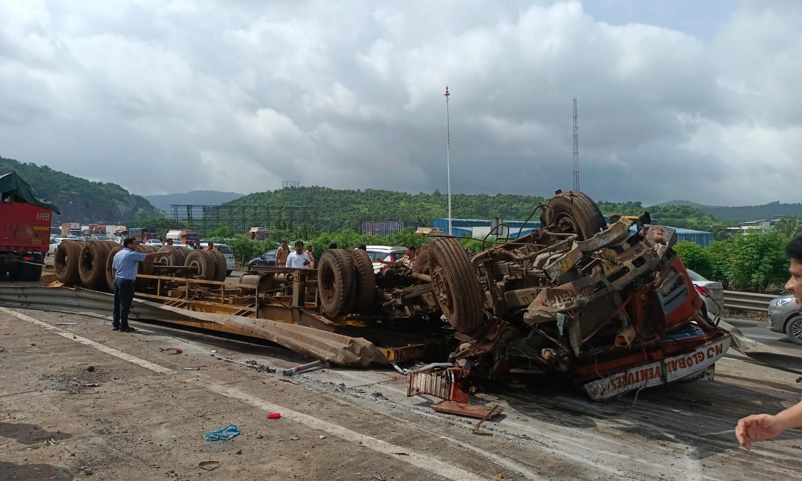 புனேயில் இருந்து நேற்று காலை மும்பை நோக்கி கன்டெய்னர் லாரி ஒன்று வந்தது. லாரி காலை 9 மணியளவில் ராய்காட் மாவட்டம் கொப்போலி அருகே மும்பை - புனே எக்ஸ்பிரஸ் விரைவு சாலையில் வேகமாக வந்து கொண்டு இருந்தது. திடீரென லாரி டிரைவரின் கட்டுப்பாட்டை இழந்தது. தறிகெட்டு ஓடிய லாரி தடுப்பு சுவரை தாண்டி மறுபுறம் உள்ள சாலைக்கு சென்று 5 கார்கள் மீது மோதிவிட்டு கவிழ்ந்தது.
