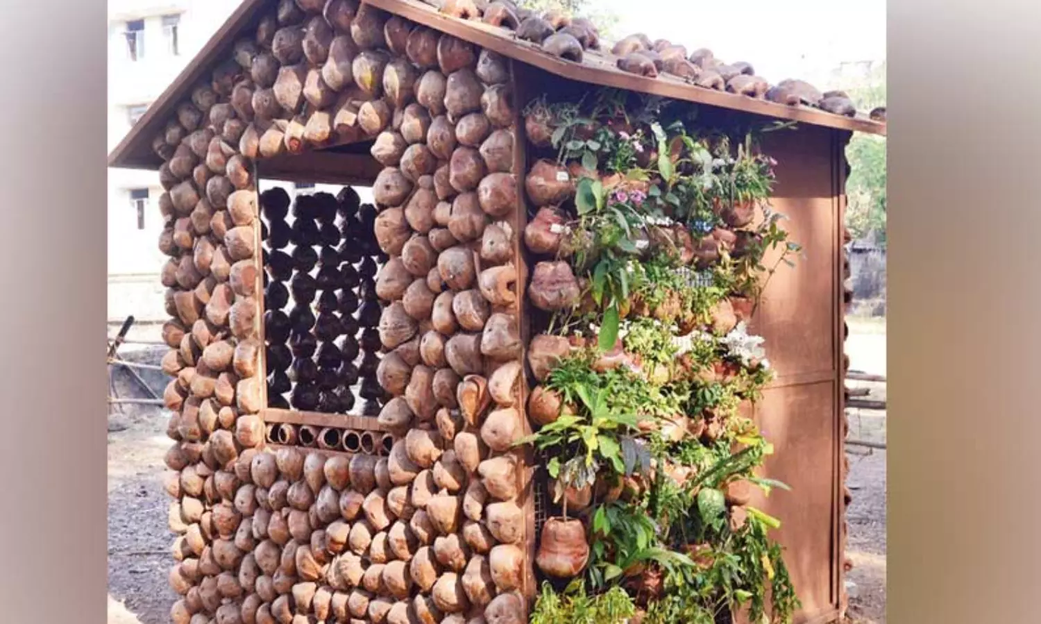மும்பையைச் சேர்ந்த மார்க்கெட்டிங் வல்லுநரான மனிஷ் அத்வானி தேங்காய் ஓடுகளின் மூலம் வீடு கட்டியுள்ளார்.;