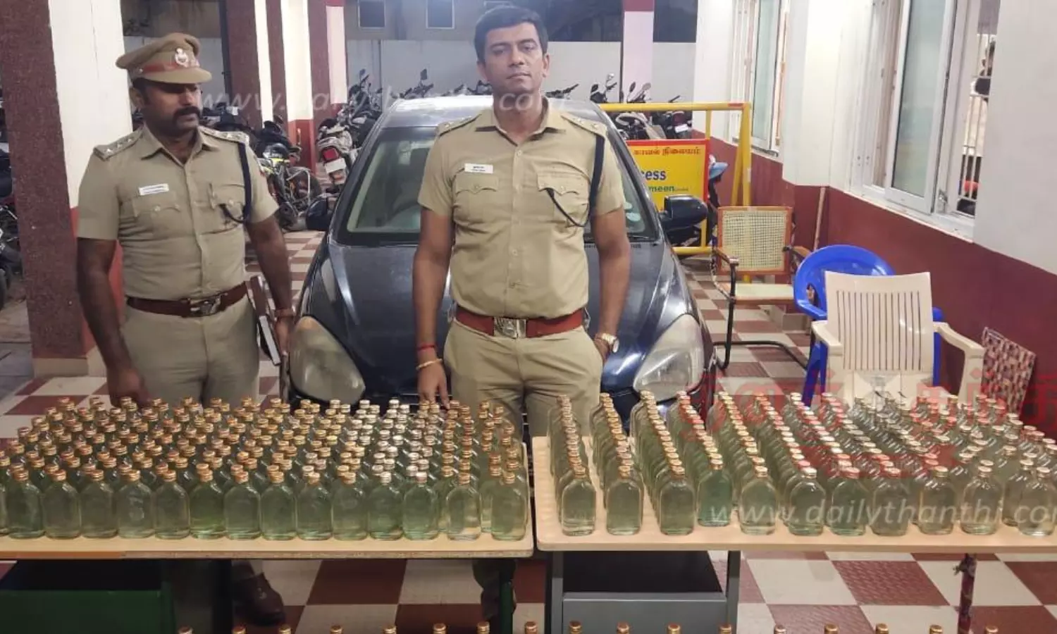 நாகை தனிப்படை போலீசார் செல்லூர் கிழக்கு கடற்கரை சாலையில் வாகன சோதனையில் ஈடுபட்டு கொண்டிருந்தனர். அப்போது அந்த வழியாக வந்த ஒரு காரை மறித்து சோதனை செய்தனர். இதில் புதுச்சேரி மாநிலத்தில் இருந்து காரில் சாராயம் கடத்தி வரப்பட்டது இதையடுத்து காரில் இருந்தவர்களிடம் போலீசார் விசாரணை நடத்தினர். விசாரணையில் அவர்கள் நாகை ராமநாயக்கன்குளம் வடகரை பகுதியை சேர்ந்த பால்பாண்டி (வயது 43), அருள்மொழித்தேவன் மெயின் ரோடு பகுதியை சேர்ந்த உதயகுமார் (25) ஆகியோர் என்பதும் புதுச்சேரி மாநிலம் காரைக்காலில் இருந்து நாகைக்கு காரில் சாராய பாட்டில்களை கடத்தி வந்தும் தெரியவந்தது. இதையடுத்து அவர்கள் 2 பேரையும் கைது செய்த போலீசார், ரூ. 25 ஆயிரம் மதிப்புள்ள சாராய பாட்டில்களுடன் காரை பறிமுதல் செய்து நாகை வெளிப்பாளையம் போலீஸ் நிலையத்திற்கு கொண்டு வந்தனர். பறிமுதல் செய்யப்பட்ட கார் மற்றும் சாராய பாட்டில்களை மாவட்ட போலீஸ் சூப்பிரண்டு ஹர்ஷ் சிங் பார்வையிட்டார்.