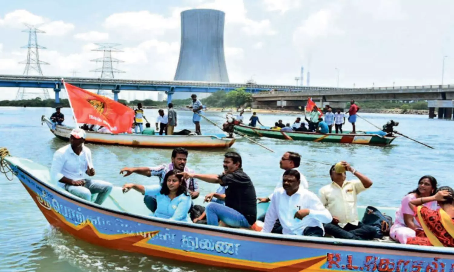 சென்னை எண்ணூர் வடசென்னை அனல் மின் நிலையம் அருகே காட்டுக்குப்பம் பகுதியில் கொசஸ்தலை ஆற்றின் நடுவே உயர் மின் கோபுரம் அமைக்கும் திட்டத்திற்கு எதிர்ப்பு தெரிவிக்கும் வகையில் நாம் தமிழர் கட்சியின் தலைமை ஒருங்கிணைப்பாளர் சீமான் கொசஸ்தலை ஆற்றில் பைபர் படகு மூலம் மீனவர்களுடன் சென்று பார்வையிட்டார்.