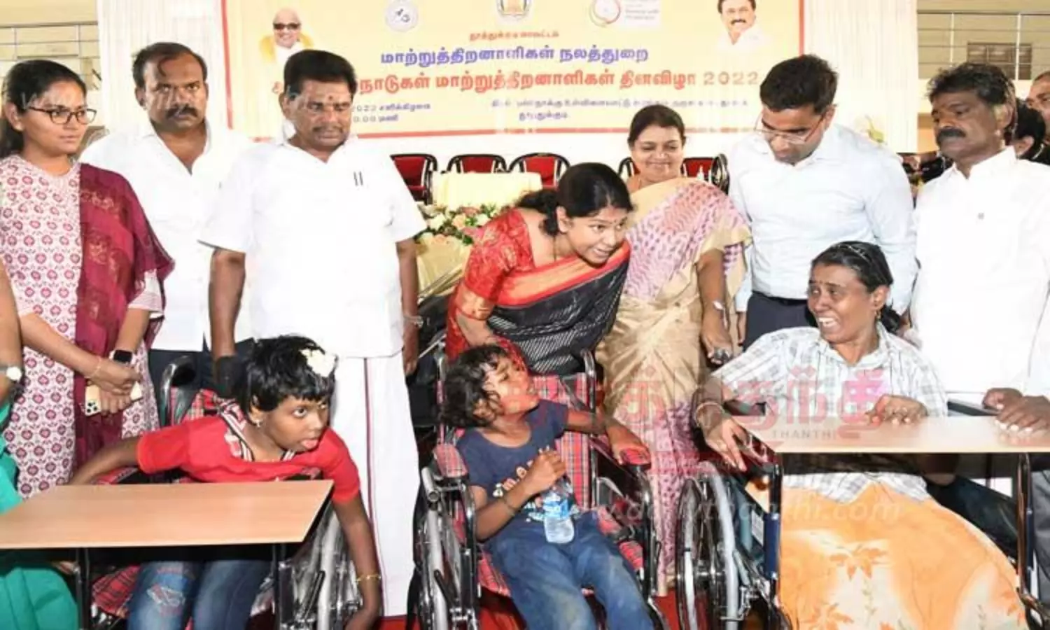 விழாவில், கனிமொழி எம்.பி. சிறப்பு விருந்தினராக கலந்துகொண்டு தேர்வு செய்யப்பட்டு இருந்த 313 மாற்றுத்திறனாளி பயனாளிகளுக்கு இருசக்கர வாகனங்கள், தையல் எந்திரங்கள், மாற்றுத்திறனாளி மோட்டார் வாகனம், ஸ்மார்ட் போன், காது கேட்கும் கருவி உள்ளிட்ட பல்வேறு வகையான பல நலத்திட்ட உதவிகளை வழங்கினார்.