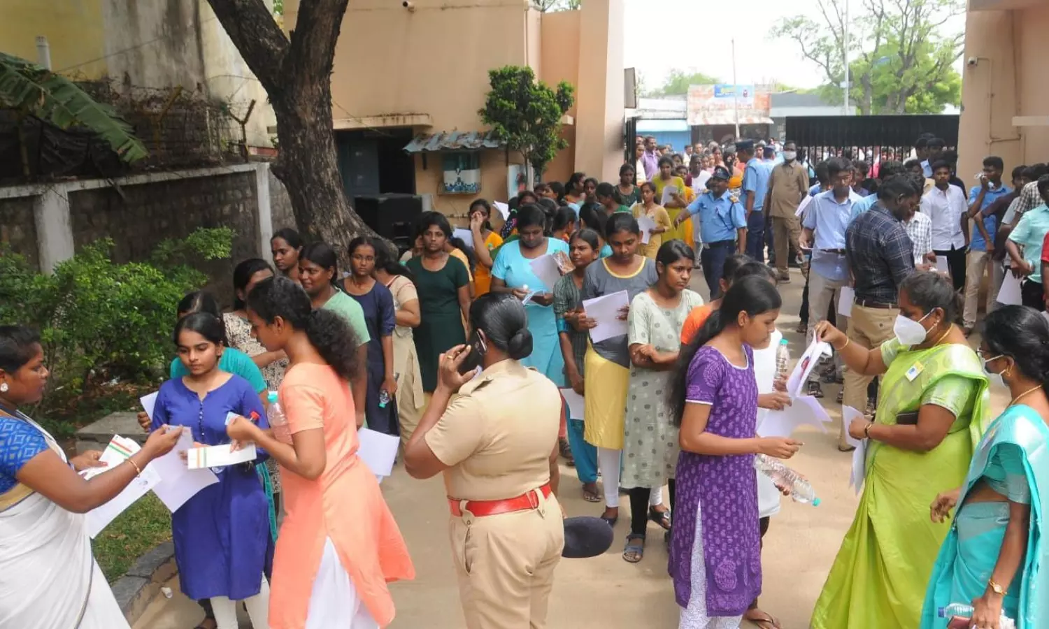 சிலர் முன்கூட்டியே வீட்டிலேயே கம்மல், வளையல் உள்ளிட்டவைகளை கழட்டி விட்டு வந்தனர். தொடர்ந்து மதியம் 2 மணிக்கு தேர்வு தொடங்கியது. தேர்வை மாணவ-மாணவிகள் ஆர்வத்துடன் எழுதினர். இந்த தேர்வை 596 மாணவ-மாணவிகள் எழுதினர். தேர்வு மாலை 5.20 மணிக்கு முடிவடைந்தது. தேர்வையொட்டி அசம்பாவிதம் ஏதும் நடைபெறாமல் இருக்க தேர்வு மையங்களில் பலத்த போலீஸ் பாதுகாப்பு போடப்பட்டிருந்தது.
