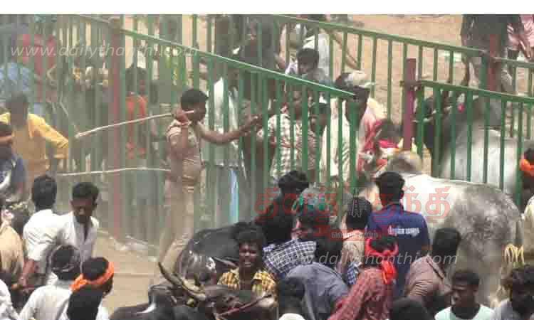 ஜல்லிக்கட்டில் காளைகள் பங்கேற்பதற்காக ஒவ்வொரு குழுவாக பிரித்து பதிவு மூப்பு அடிப்படையில் தடுப்பு வேலிகளுக்குள் காளைகளை போலீசார் அனுமதித்தனர். அப்போது சிலர் இந்த முறையை பின்பற்றாமல் தடுப்பு வேலியை பக்கவாட்டில் சரித்து தங்களது காளைகளை உள்ளே போக செய்தனர். இதையடுத்து அங்கு பாதுகாப்பு பணியில் இருந்த போலீசார் லேசான தடியடி நடத்தி கூட்டத்தை கலைத்தனர். இதனால் அப்பகுதியில் சிறிது நேரம் பரபரப்பு ஏற்பட்டது. பின்னர் ஜல்லிக்கட்டு காளைகள் வரிசையாக அனுப்பப்பட்டன.
