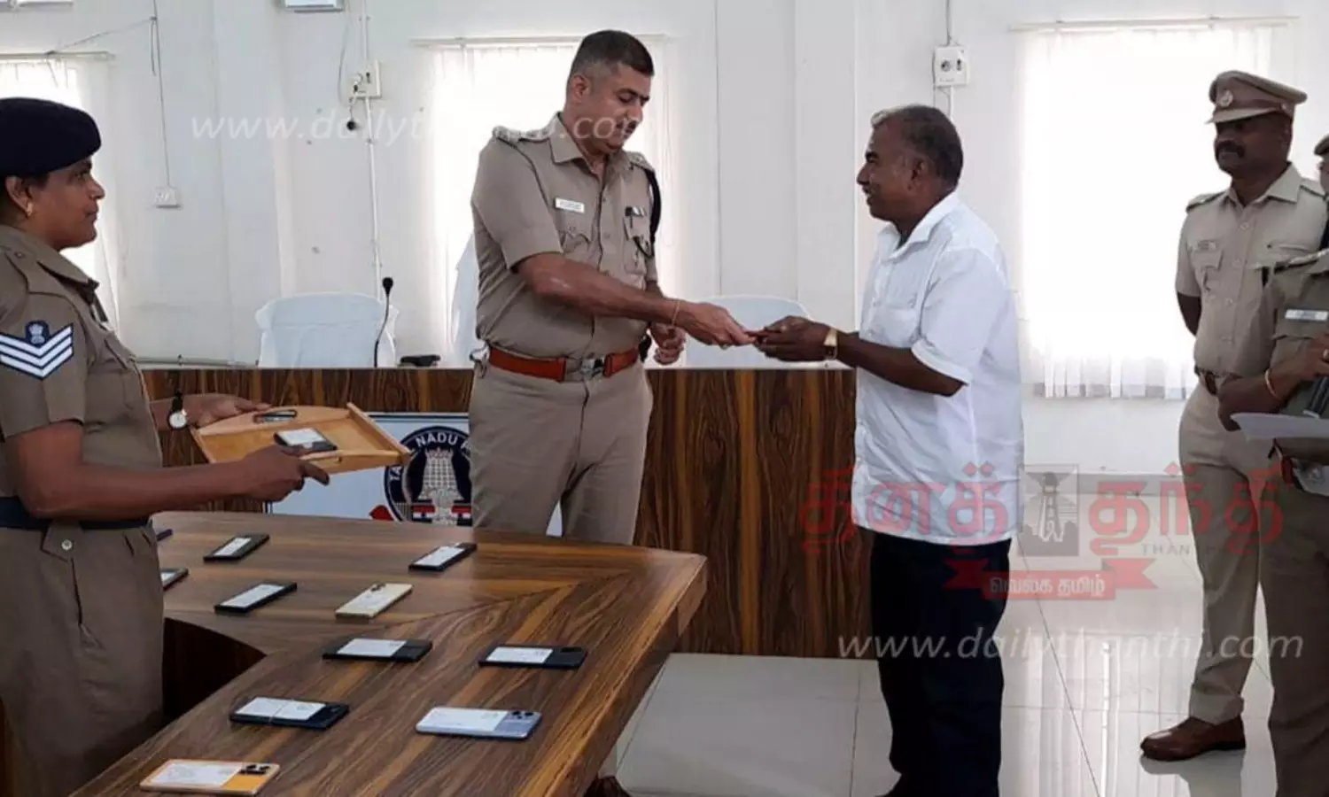 அதன்படி திருட்டு போன ரூ.10 லட்சத்து 53 ஆயிரத்து 500 மதிப்புள்ள 70 ஆண்ட்ராய்டு செல்போன்களை உரிமையாளர்களிடம் ஒப்படைக்கும் நிகழ்ச்சி நேற்று திருவாரூர் மாவட்ட போலீஸ் சூப்பிரண்டு அலுவலகத்தில் நடைபெற்றது. நிகழ்ச்சியில் செல்போன் காணாமல் போனதாகவும், திருட்டு போனதகாவும் புகார் கொடுத்தவர்களுக்கு மாவட்ட போலீஸ் சூப்பிரண்டு சுரேஷ்குமார் செல்போன்களை ஒப்படைத்தார். இதையடுத்து போலீஸ் சூப்பிரண்டிடம் இருந்து உரிமையாளர்கள் தங்களது செல்போன்களை பெற்றுக்கொண்டனர்.