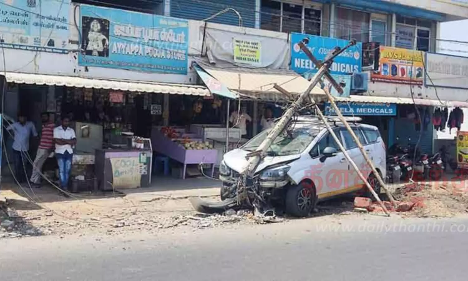 இந்த விபத்தில் மின்கம்பம் 2 துண்டாக முறிந்து கார் மீது விழுந்தது. ஆனால் அதிர்ஷ்டவசமாக கார் டிரைவர் உயிர் தப்பினார்.