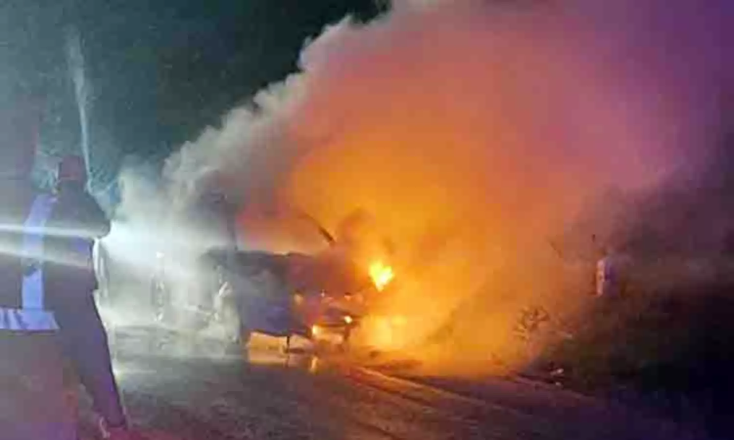 சாலையில் ஓடிய கார் திடீரென தீப்பற்றி எரிந்தது