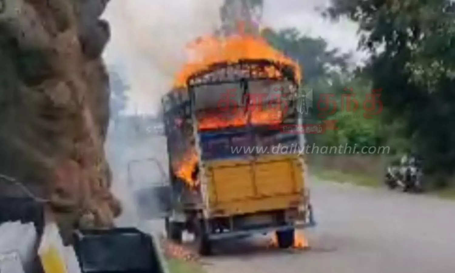 தகவலறிந்து வந்த தேன்கனிக்கோட்டை தீயணைப்புத்துறையினர் போராடி தீயை அணைத்தனர். வாகனம் முழுவதும் எரிந்து சேதமானது. தேன்கனிக்கோட்டை போலீசார் வழக்குப்பதிவு செய்து விசாரணை நடத்தி வருகின்றனர்.