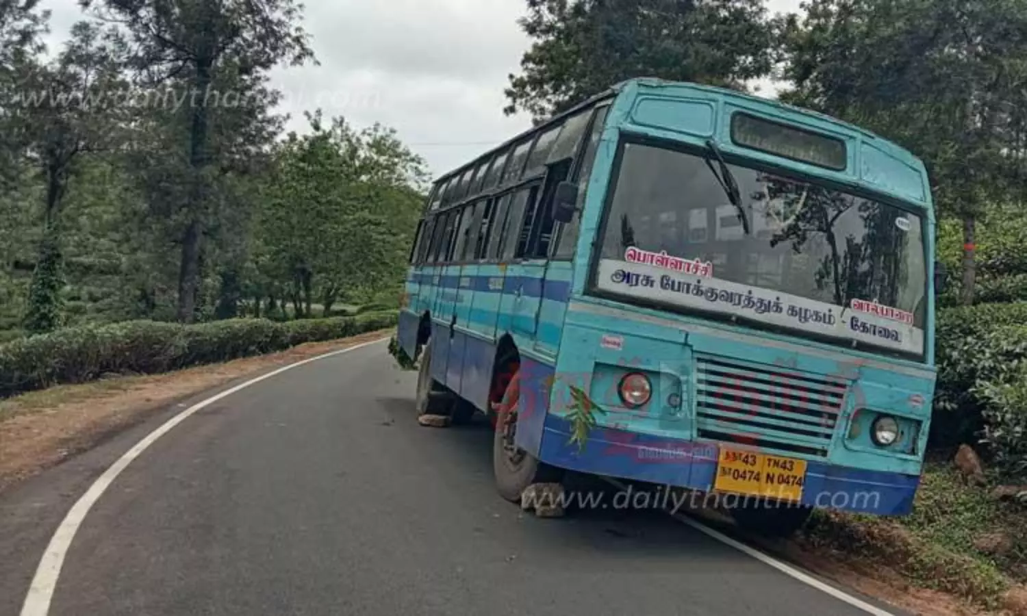 பொள்ளாச்சியில் இருந்து நேற்று காலை 6 மணிக்கு வால்பாறை அருகே உள்ள ஹைபாரஸ்ட் எஸ்டேட் பகுதிக்கு அரசு பஸ் ஒன்று வந்தது. பின்னர் காலை 10.30 மணிக்கு அங்கிருந்து 25 பயணிகளுடன் பொள்ளாச்சியை நோக்கி திரும்பி சென்று கொண்டு இருந்தது.