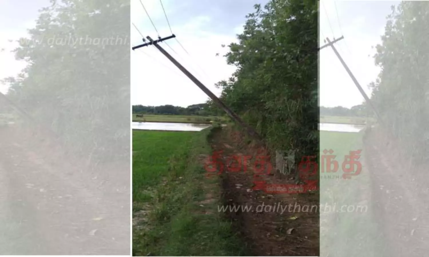 வயல்வெளி பகுதியில் சாய்ந்து ஆபத்தான நிலையில் உள்ள மின்கம்பம்