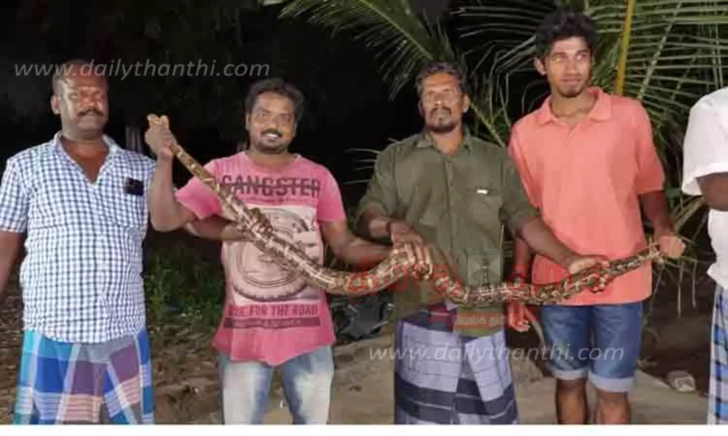 திருப்பரங்குன்றத்தை அடுத்த ஹார்விப்பட்டி பஸ் நிறுத்தம் அருகே நிலையூர் கால்வாய் அமைந்து உள்ளது. தற்போது கால்வாயில் மழையின் உபரிதண்ணீரும், வைகை அணையில் இருந்து பாசனத்திற்காக திறக்கப்பட்ட தண்ணீரும் சென்று கொண்டிருக்கிறது. இந்த நிலையில் ஹார்விப்பட்டி சார்ந்த நிலையூர் கால்வாயின் கரையின் வழியாக நேற்று மாலையில் மலைப்பாம்பு ஊர்ந்து சென்றுள்ளது. அதை கண்டவர்கள் மதுரை வனத்துறைக்கும், பாம்புபிடி வீரரான மதுரை சினேக் சகாவிற்கும் தகவல் தெரிவித்தனர்.இதனையடுத்து மதுரை வனத்துறை அலுவலர் (ரேஞ்சர்) மணிகண்டன், சினேக் சகா ஆகியோர் விரைந்து வந்து சுமார் 6 அடி நீளமுள்ள ஒரு மலைப்பாம்பை பிடித்து பாதுகாப்பாக நாகமலைபுதுக்கோட்டை வனப்பகுதியில் விட்டனர்.