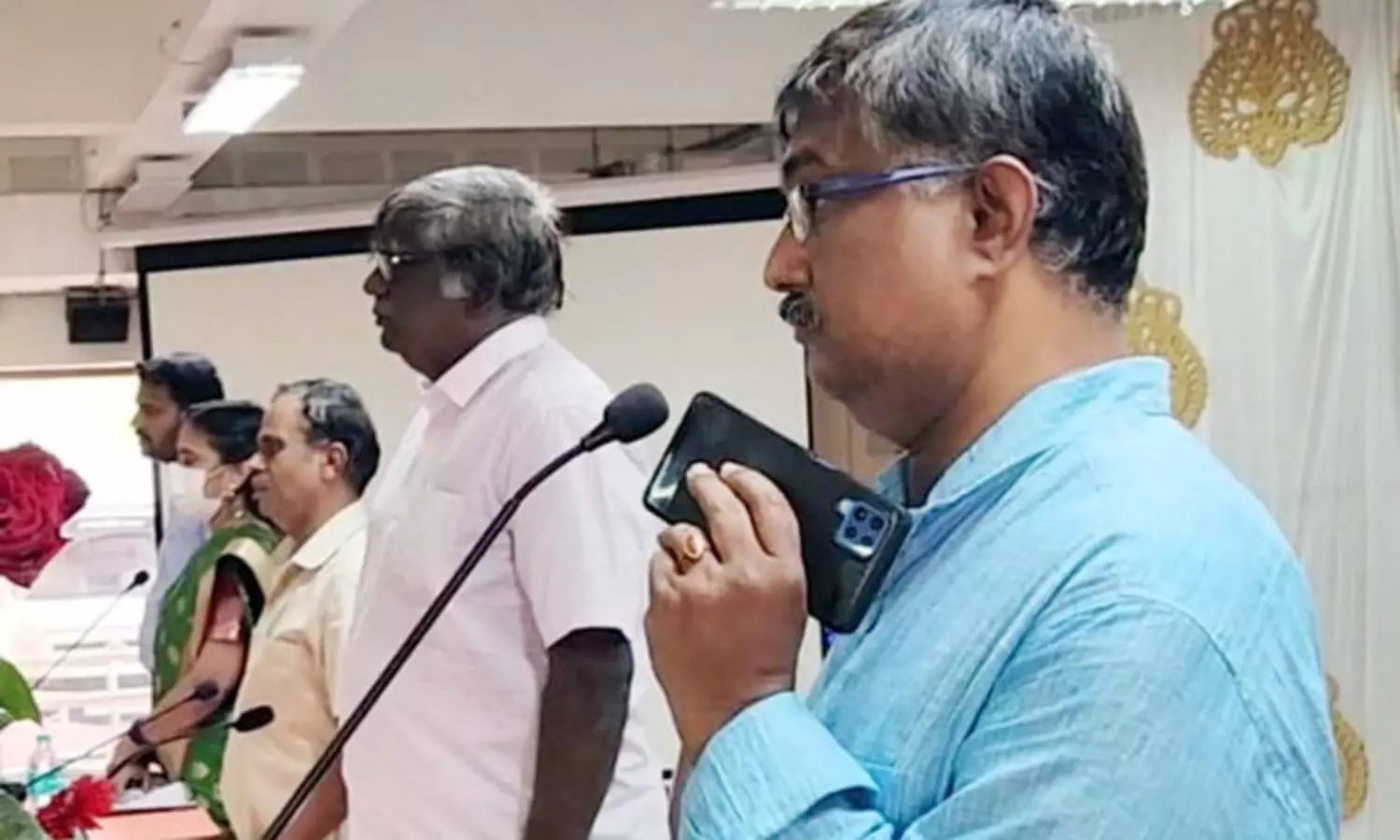 தமிழ்த்தாய் வாழ்த்து பாடலை வாய்ப்பாட்டாக பாடவேண்டும் என்று அரசு உத்தரவு உள்ள நிலையில், செல்போன் மூலம் ஒலித்த சம்பவத்தால் கூட்டத்தில் சிறிது நேரம் சலசலப்பு ஏற்பட்டது. பின்னர் கருத்தரங்கு தொடர்ந்து நடைபெற்றது.