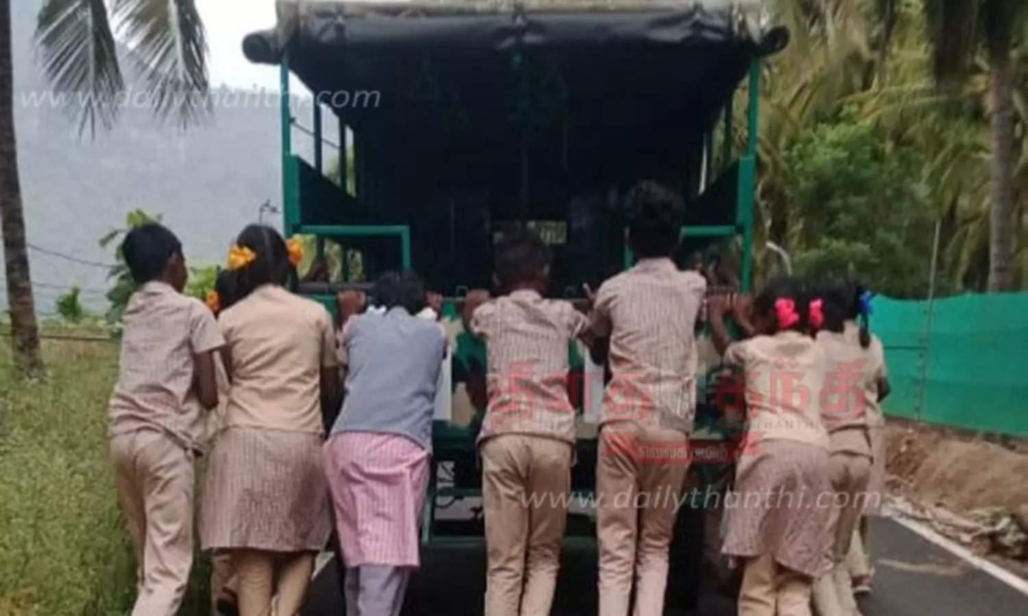 அடிக்கடி பழுதாகும் பேட்டரி வாகனம்; தள்ளிச்செல்லும் பழங்குடியின மாணவர்கள்