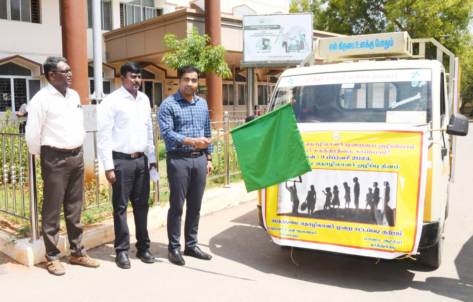 தூத்துக்குடியில் கொத்தடிமை தொழிலாளர் முறை ஒழிப்பு விழிப்புணர்வு பிரசார வாகனத்தை கலெக்டர் செந்தில்ராஜ் கொடியசைத்து தொடங்கி வைத்தார்.