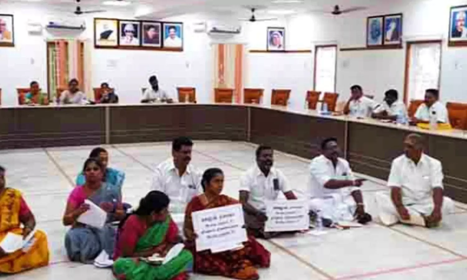 அப்போது அ.தி.மு.க., பா.ஜ.க. கவுன்சிலர்கள் எழுந்து அடிப்படை வசதிகள், சுகாதார வசதிகள் நிறைவேற்றவில்லை என்று கோரிக்கைகள் எழுதிய பதாகைகளை கையில் ஏந்தி கூட்டரங்கின் தரையில் அமர்ந்து தர்ணா போராட்டத்தில் ஈடுபட்டனர்.
