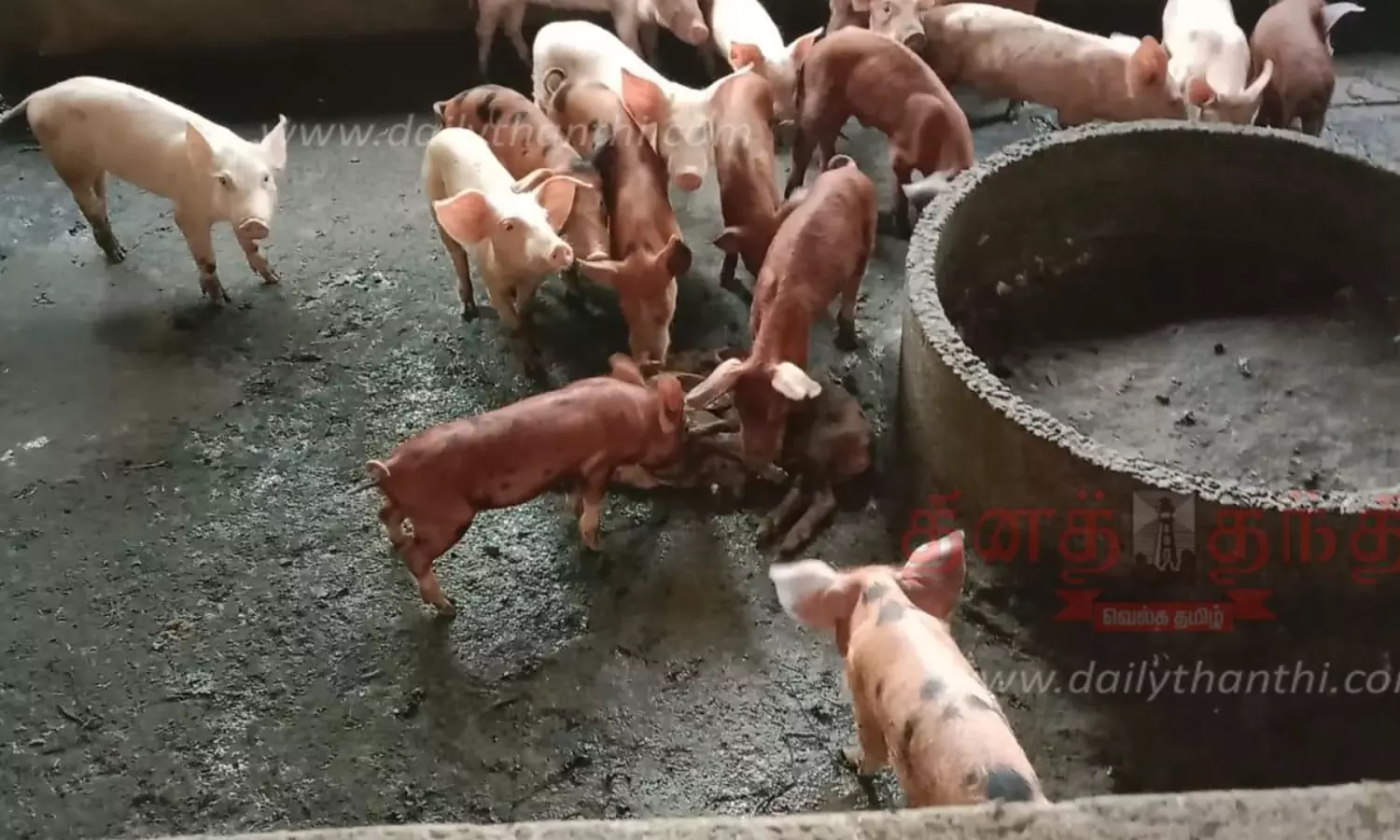 நாமக்கல் மாவட்டம் ராசிபுரம் அருகே உள்ள கல்லாங்குளம் கிராமத்தைச் சேர்ந்தவர் ராஜாமணி. இவர் சில ஆண்டுகளாக வெண் பன்றி பண்ணை நடத்தி வருகிறார். இங்கு வளர்க்கப்படும் வெண் பன்றிகளை கேரளா போன்ற மாநிலங்களுக்கு அனுப்பி வைத்து வந்ததாக கூறப்படுகிறது.