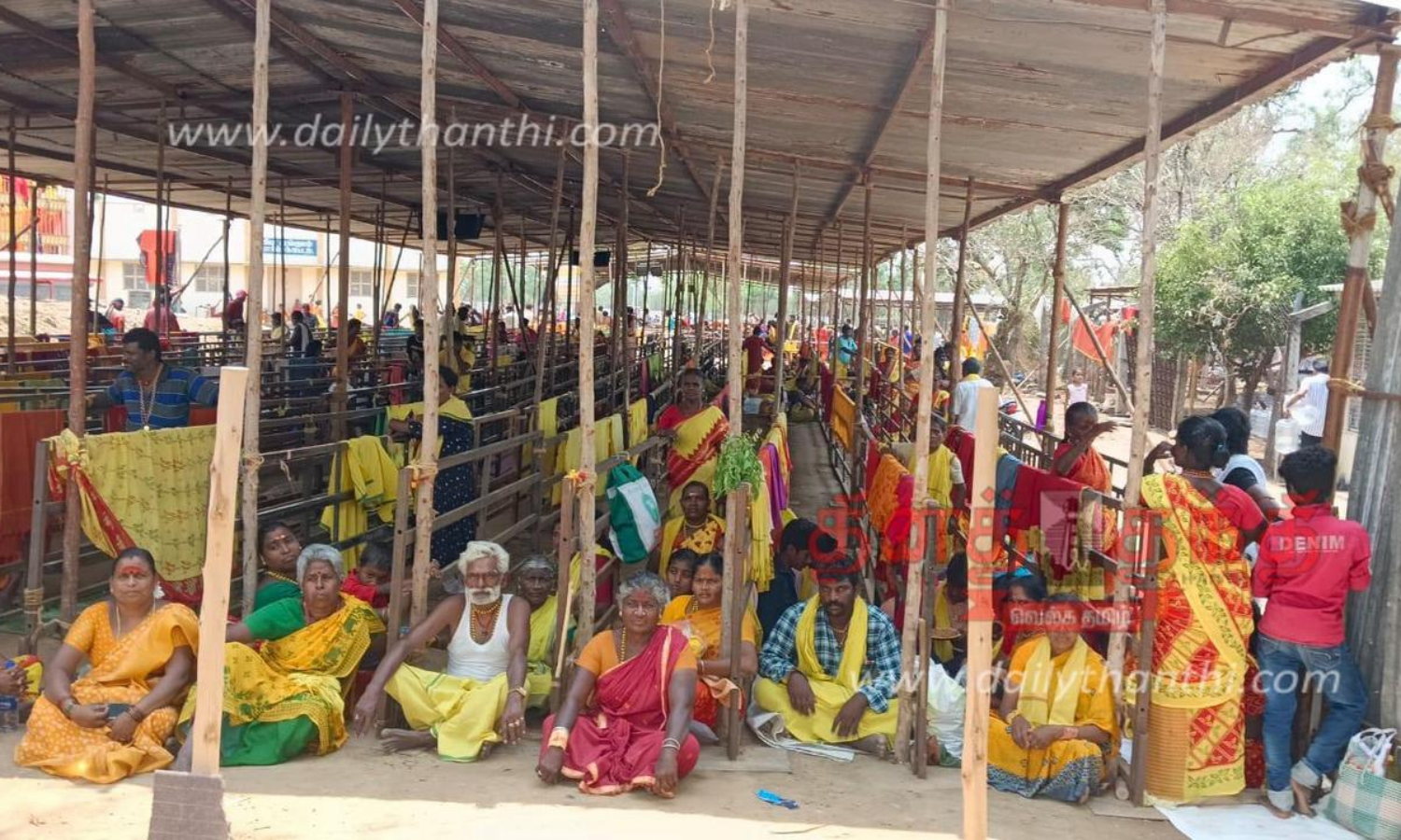 பிரசித்தி பெற்ற பண்ணாரி மாரியம்மன் கோவிலில் குண்டம் திருவிழா நாளை (செவ்வாய்க்கிழமை) நடக்கிறது. தீ மிதிக்க வரிசையில் இடம் பிடித்து பக்தர்கள் காத்திருக்கிறார்கள்.